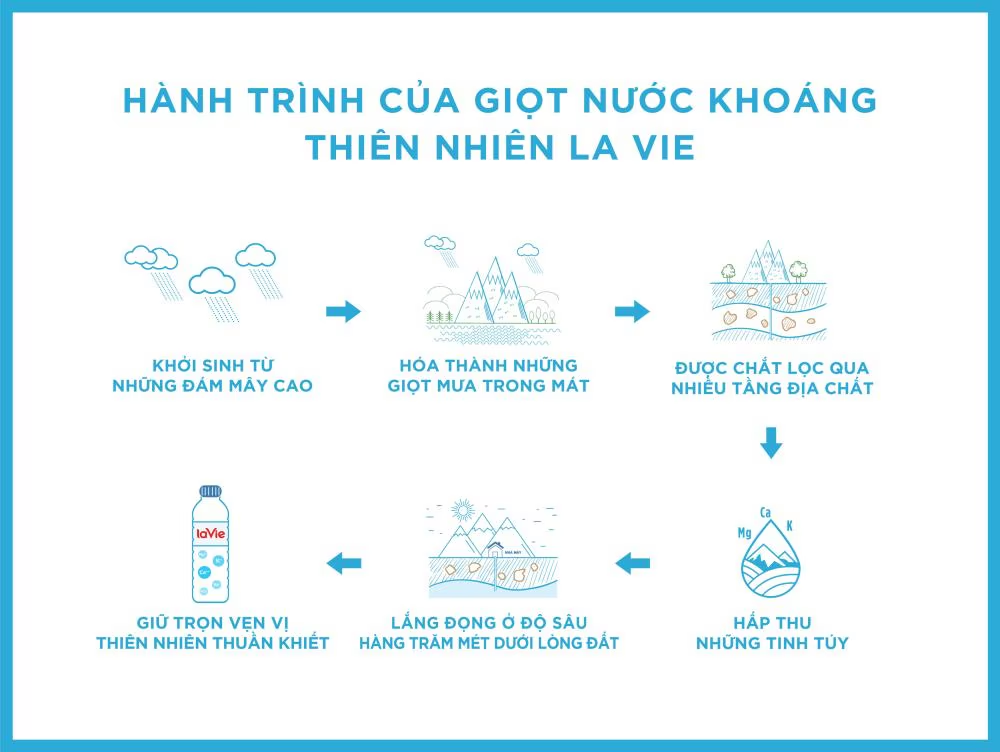 Nguồn nước khoáng LaVie được hình thành từ quá trình chắt lọng của thiên nhiên. Khởi đầu từ những giọt nước mưa tại những vùng núi xa xăm cách đây hàng trăm năm; Từ những vùng núi xa xăm đó, dòng nước này đã chảy qua hàng trăm km; Chúng thấm qua nhiều tầng địa chất, được chắt lọc một cách tự nhiên và tích tụ các khoáng chất thiết yếu; Lắng đọng tại mạch nước khoáng nằm sâu hàng trăm mét dưới lòng đất, cách xa mọi ô nhiễm hoá chất & vi sinh vật.